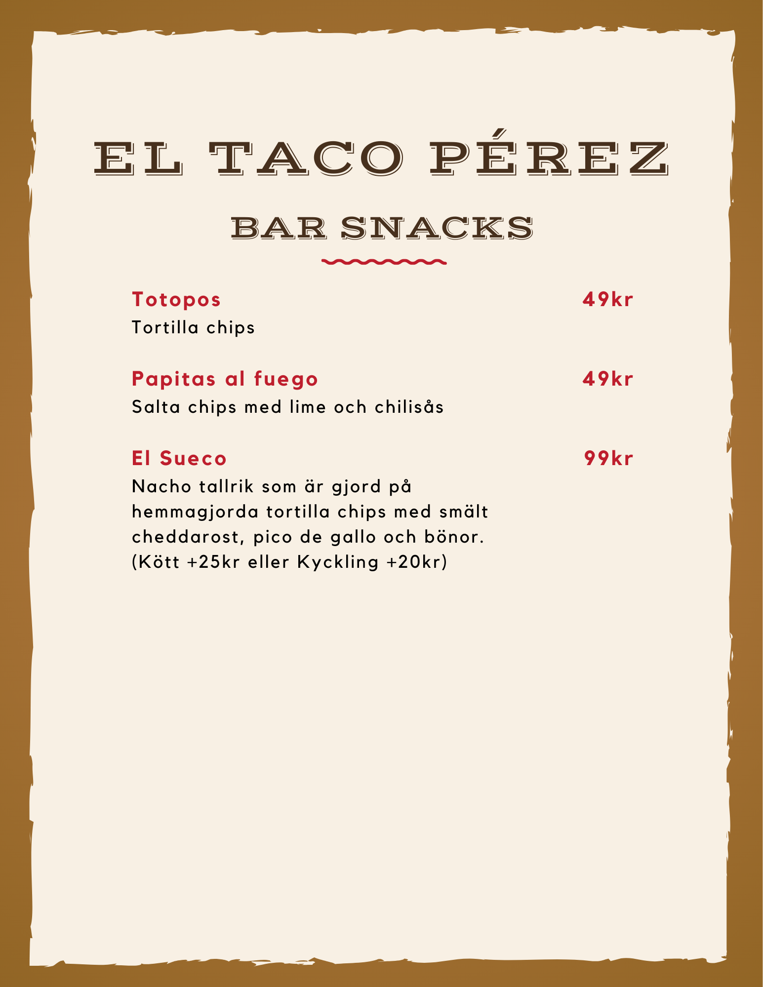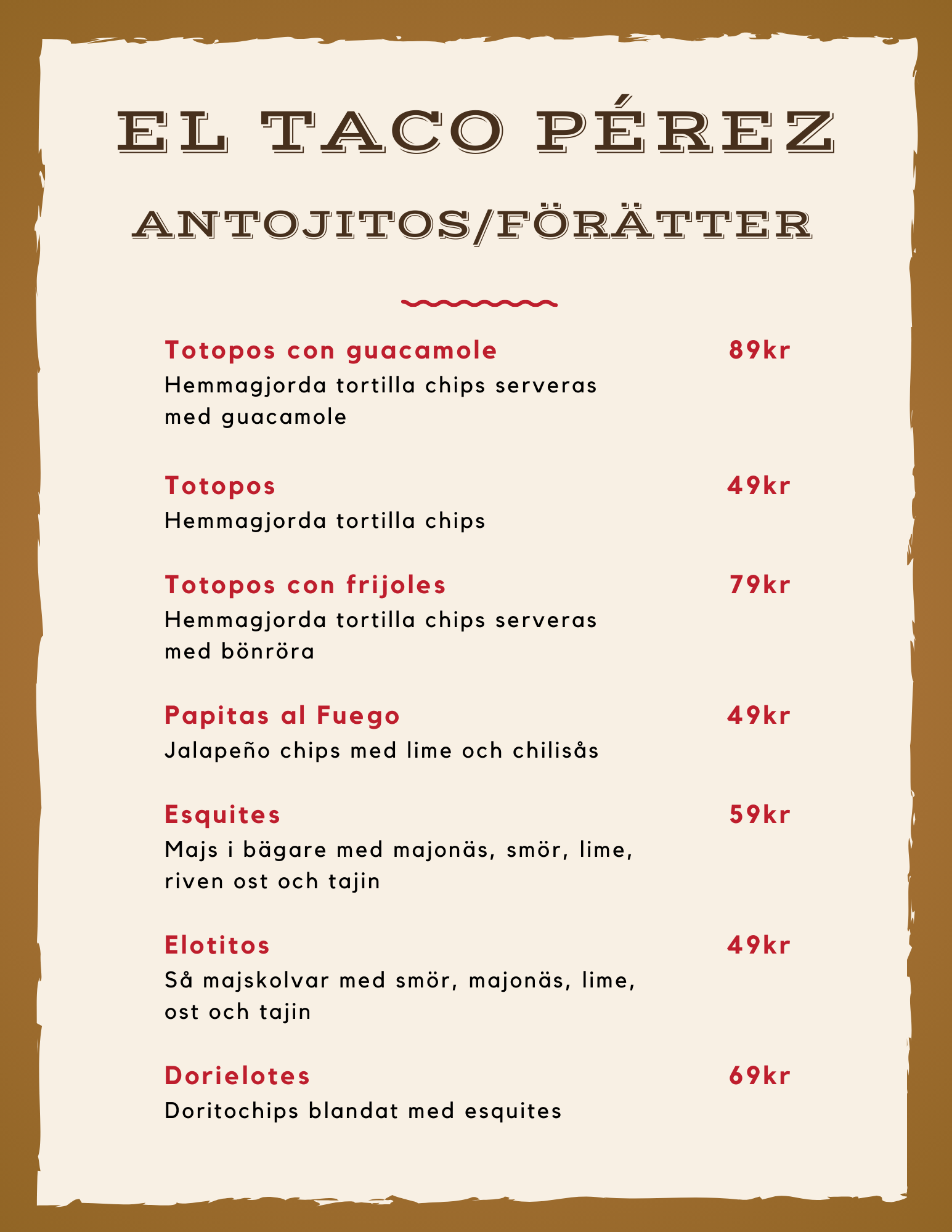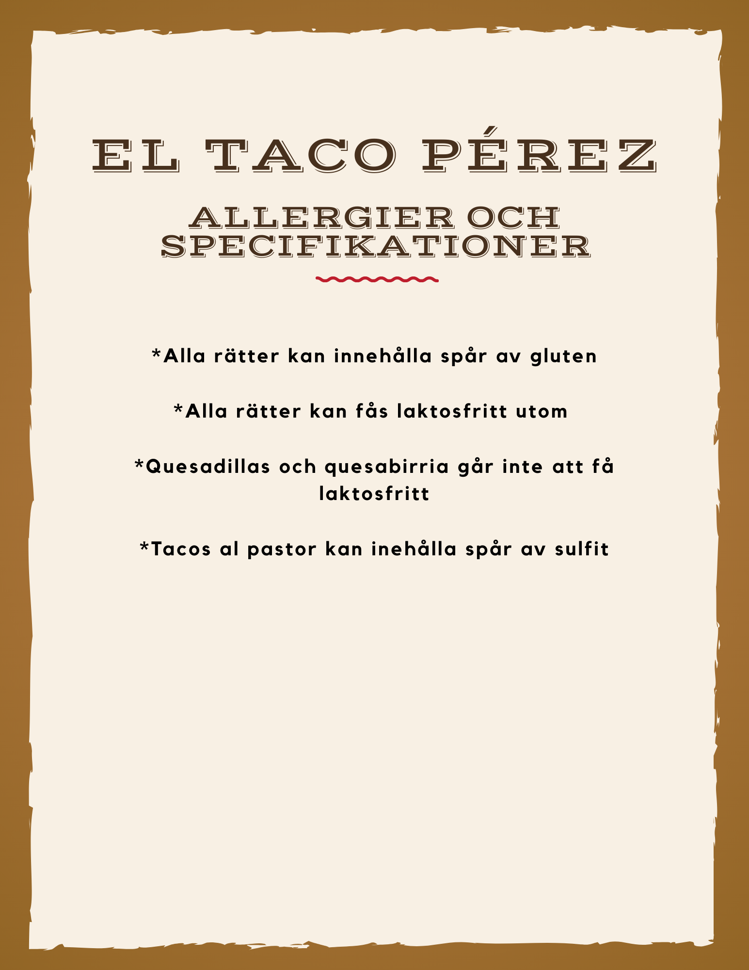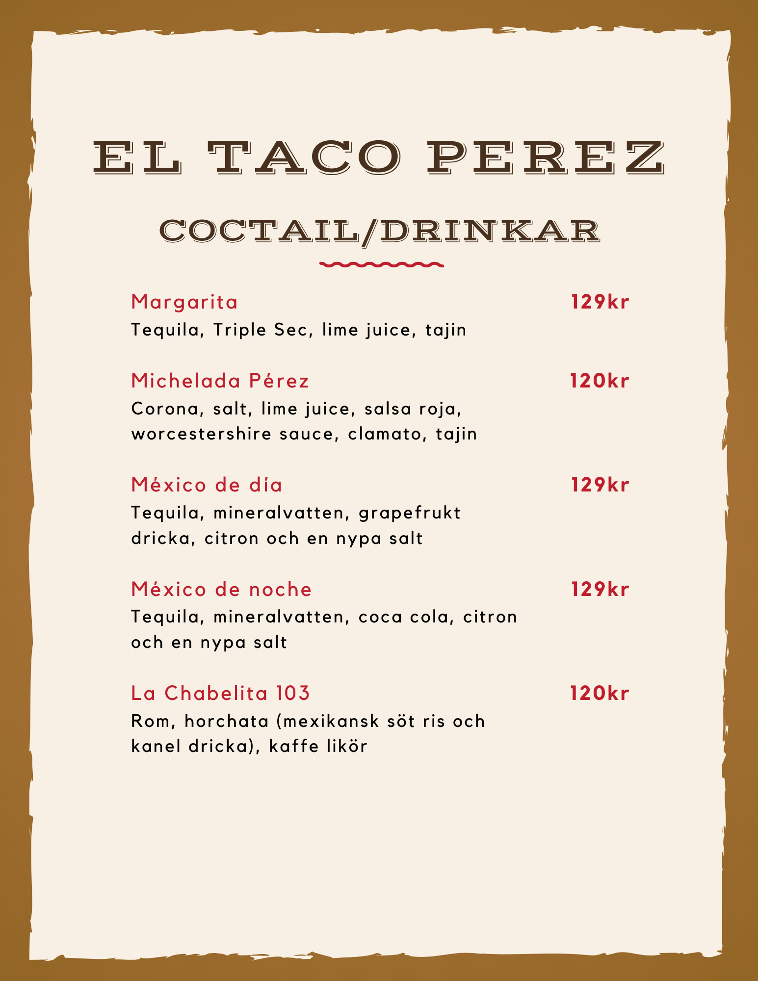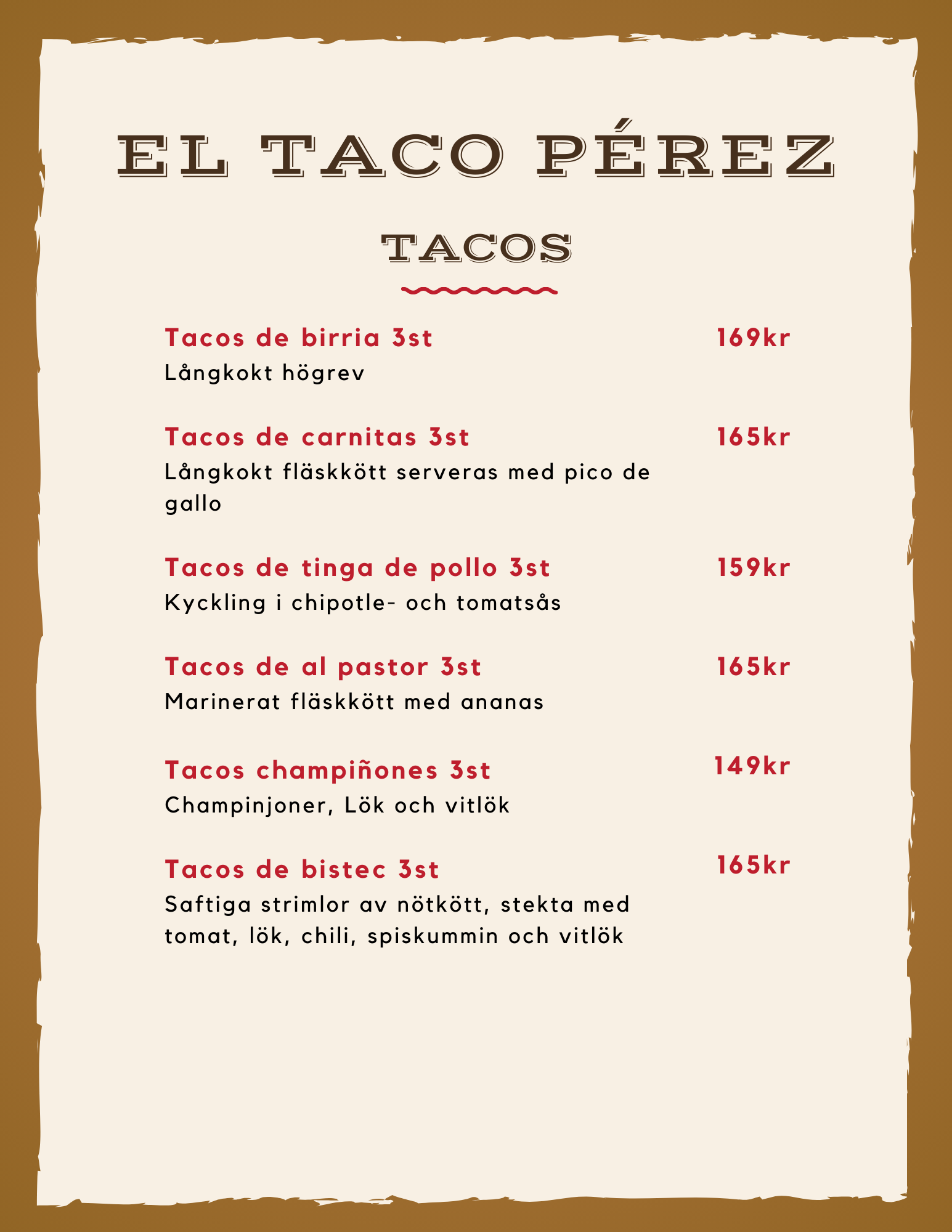 El Taco Pérez är Skövdes egen port till México där vi bjuder på en autentisk kulinarisk resa. Våra traditionella mexikanska rätter lagas med kärlek och färska, högkvalitativa råvaror för att ge dig en smakrik och minnesvärd matupplevelse. Vi är stolta över att dela den rika och färgstarka mexikanska kulturen genom varje tugga.