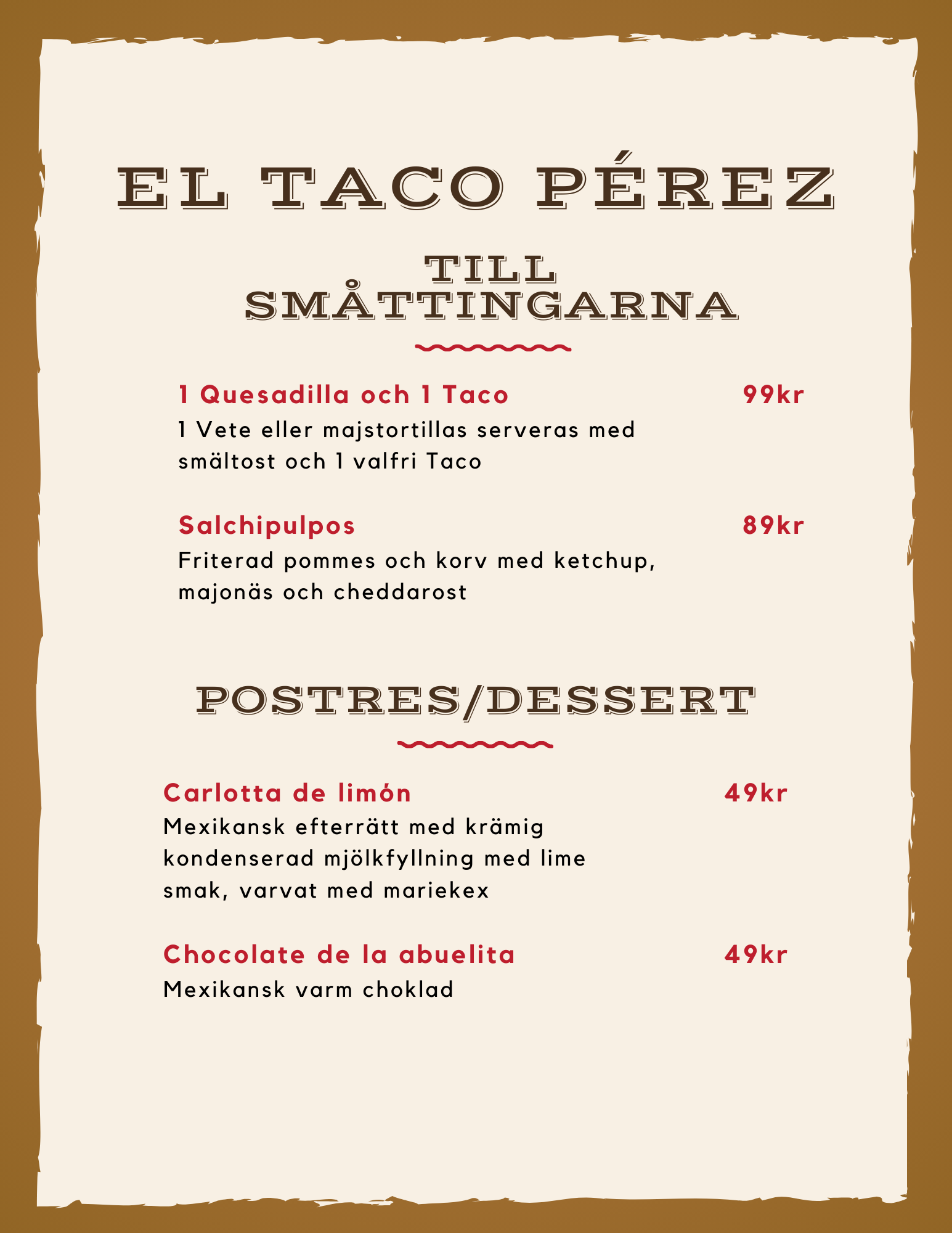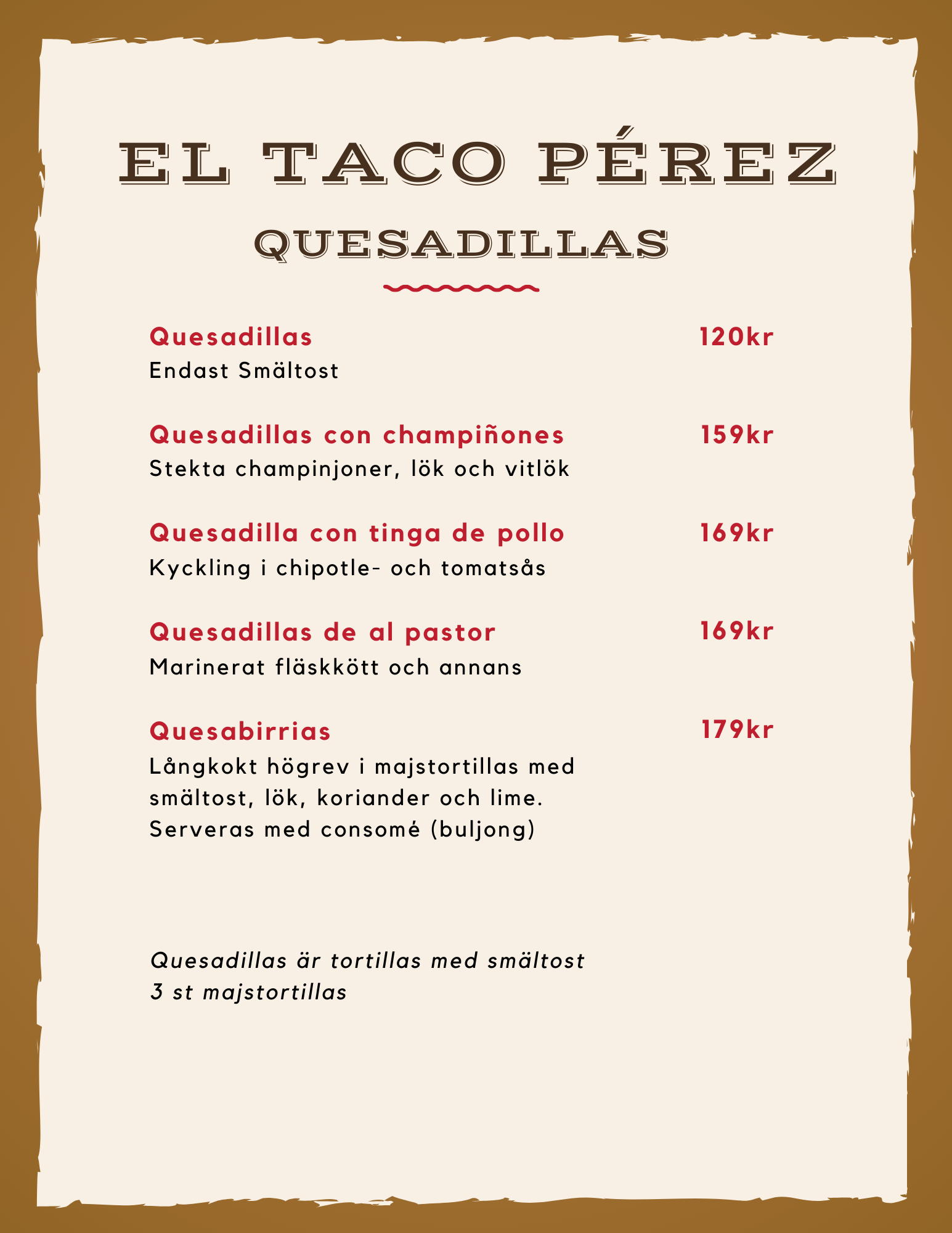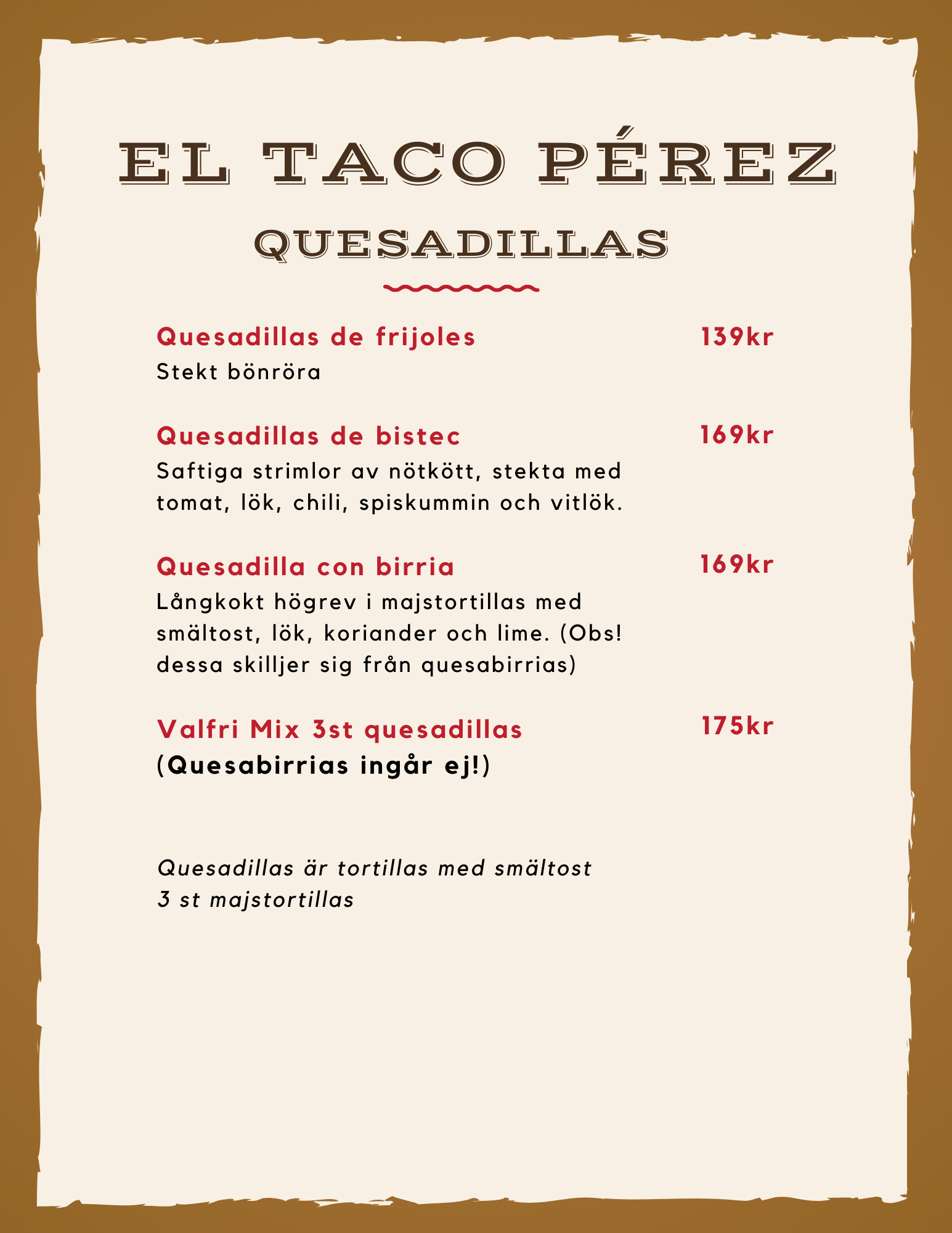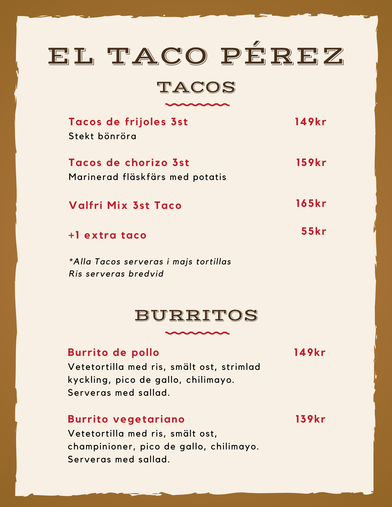 El Taco Pérez är Skövdes egen port till México där vi bjuder på en autentisk kulinarisk resa. Våra traditionella mexikanska rätter lagas med kärlek och färska, högkvalitativa råvaror för att ge dig en smakrik och minnesvärd matupplevelse. Vi är stolta över att dela den rika och färgstarka mexikanska kulturen genom varje tugga.